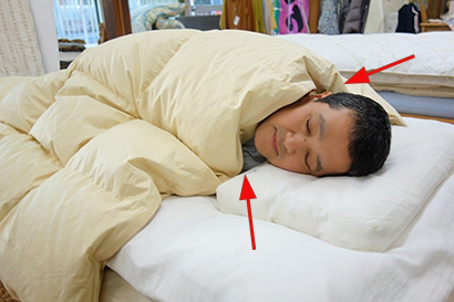ただ軽ければ良いという訳ではありません。 「羽毛ふとんは軽すぎて寒い・・・」 「寝返りや横向きになると肩や背中が開いて寒い・・・」 などよく聞きます。 ご安心ください。イワタの羽ふとんは、掛ふとんの大切な働きである「追動性」( ついどうせい ) に優れているので、 軽くても身体にピッタリフィットします。