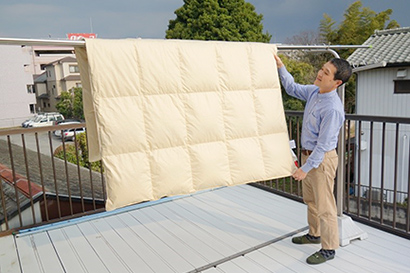 イワタの羽ふとんは、「イオゾン・アルファ 2 処理」を施した清潔な羽毛だけが入っているので、不純物が噴き出す心配がありません。 ですから生地に樹脂加工はしません。 それなので天日干しができていつでも清潔に保てます。 もちろん無理に干す必要はありませんよ。 干しすぎは痛みの原因になりますので気を付けてください。