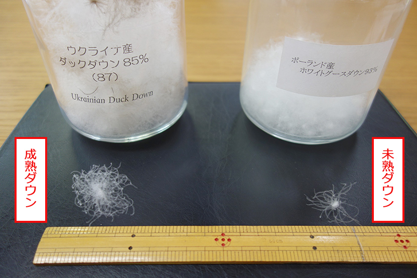 市販の羽毛ふとんのほとんどがその「未熟ダウン」なのです。 下の写真は左がウクライナ産ダックダウン 85 %、右がポーランド産グースダウン 93 % です。