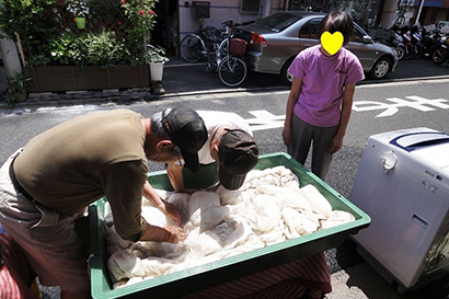 最近洗えるふとんが多くなってきていますが、その洗えるふとんのほとんどポリエステルの生地です。 先程話したように、ポリエステルは水を吸わないので、中の汚れは落ちません。 ウクライナ羽ふとんは中まできれい洗えます。 ご家庭でも洗えますが、当店で「洗濯教室」をやっていますから参加してください。
